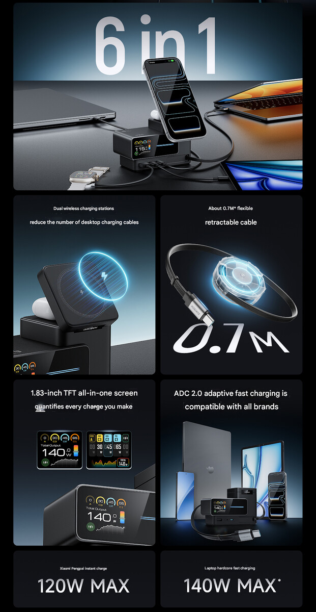 - Sạc nhanh công suất 140W: Hỗ trợ chuẩn PD3.1, PPS2.0, QC và Mi Turbo, tương thích với nhiều thiết bị như điện thoại, máy tính bảng, laptop, MacBook…